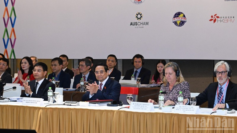 Thủ tướng Phạm Minh Chính khẳng định Chính phủ Việt Nam luôn đồng hành, cầu thị, lắng nghe các ý kiến đóng góp của cộng đồng doanh nghiệp. (Ảnh: TRẦN HẢI)