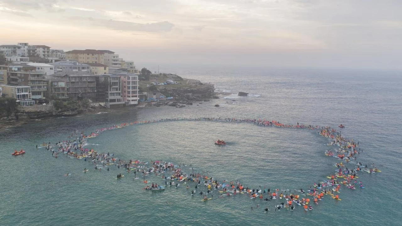 Hình ảnh trên không do Đài truyền hình Australia (ABC) ghi lại cho thấy, các vận động viên chèo ván và lướt sóng tạo thành một vòng tròn lớn trên mặt biển.