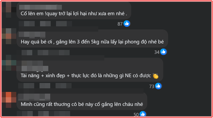 Không chỉ giọng hát, ngoại hình rạng rỡ cùng thần thái tươi tắn của Nam Em trong lần xuất hiện này cũng khiến người xem thích thú. Nhiều ý kiến nhận xét cô trở nên dịu dàng, nữ tính và bình yên hơn trước, đồng thời gửi lời động viên, mong Nam Em giữ gìn sức khỏe và lấy lại phong độ như thời kỳ đỉnh cao.