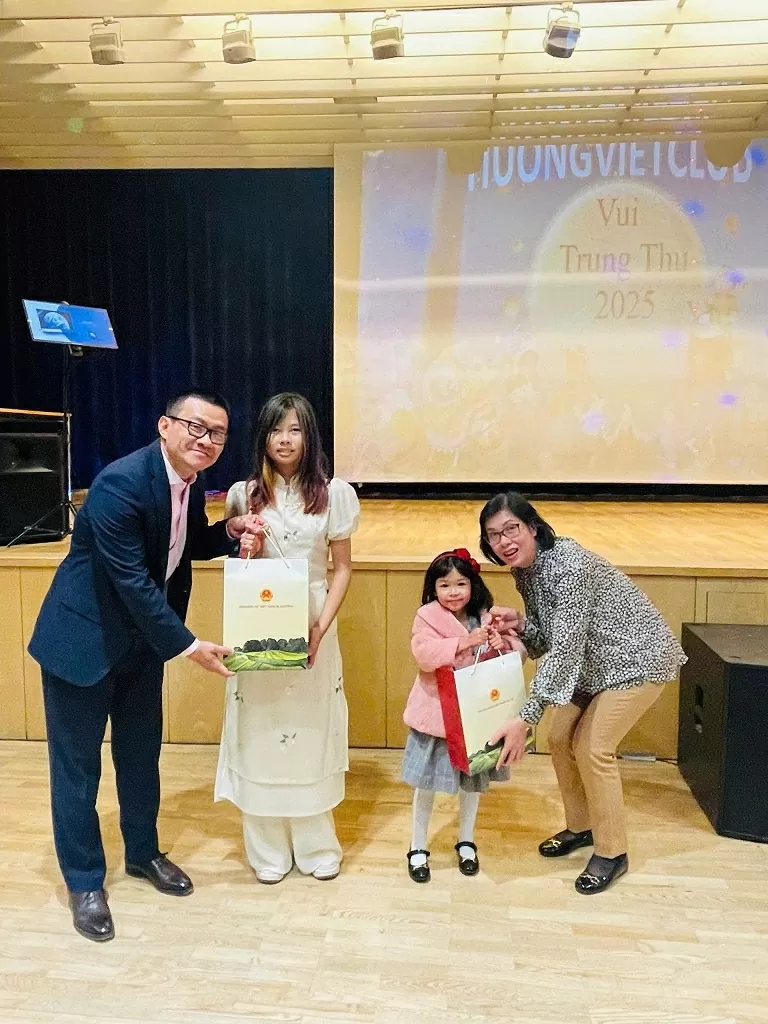 Nhân dịp này, Đại sứ Vũ Lê Thái Hoàng và phu nhân tặng quà Trung Thu cho các cháu thiếu nên, nhi đồng – thế hệ tương lai của cộng đồng người Việt Nam tại Áo.