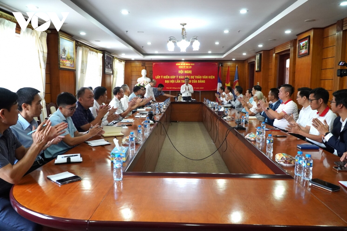 Hội nghị lấy ý kiến góp ý vào các dự thảo văn kiện trình Đại hội XIV của Đảng diễn ra dưới sự chủ trì của Đại sứ Việt Nam tại Lào Nguyễn Minh Tâm.