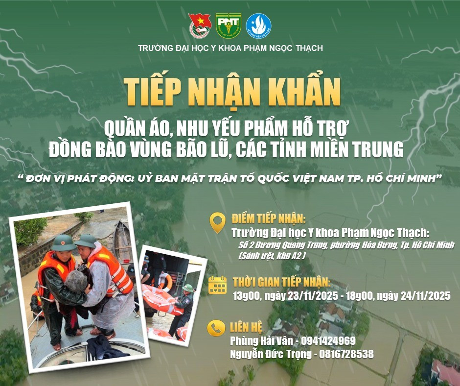 Fanpage Đoàn trường ĐH Y khoa Phạm Ngọc Thạch thông báo: "Chúng tôi trân trọng tiếp nhận mọi sự đóng góp của cộng đồng với các vật phẩm cần thiết: Quần áo mới, cũ đã giặt sạch, phơi khô; phân loại nam/nữ/trẻ em (các thông tin ghi rõ bên ngoài), nhu yếu phẩm còn hạn sử dụng, bao bì nguyên vẹn (mì gói, đồ hộp, gạo, nước uống, chăn mền, áo mưa...). Tuổi trẻ Y khoa Phạm Ngọc Thạch xin chân thành cảm ơn sự chung tay và lan tỏa thông tin từ cộng đồng".