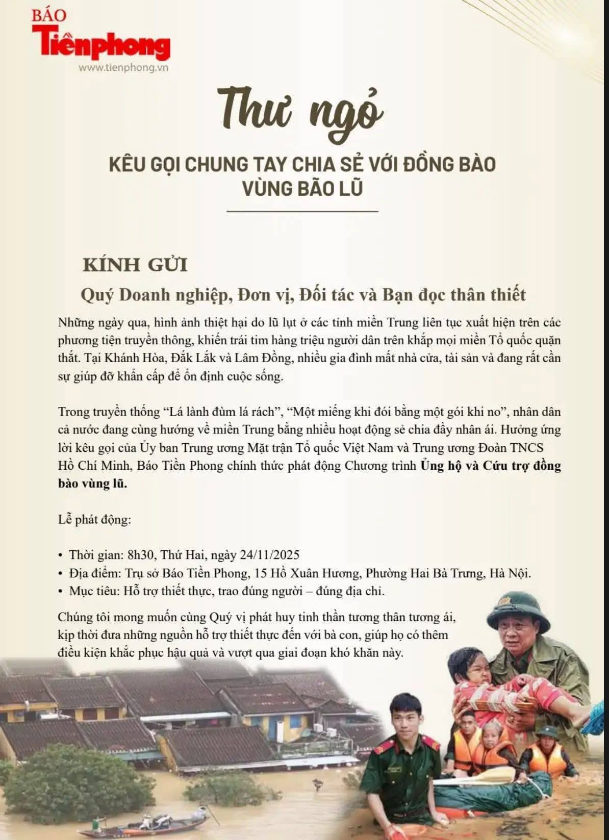 Báo Tiền Phong chính thức phát động cùng chung tay hướng về đồng bào miền Trung thân yêu. Báo Tiền Phong trân trọng kêu gọi bạn đọc và các đối tác của báo Tiền Phong tiếp tục đồng hành, chung sức, chung lòng hướng về đồng bào miền Trung, Tây Nguyên thông qua chương trình: Chung tay vì đồng bào miền Trung, Tây Nguyên.