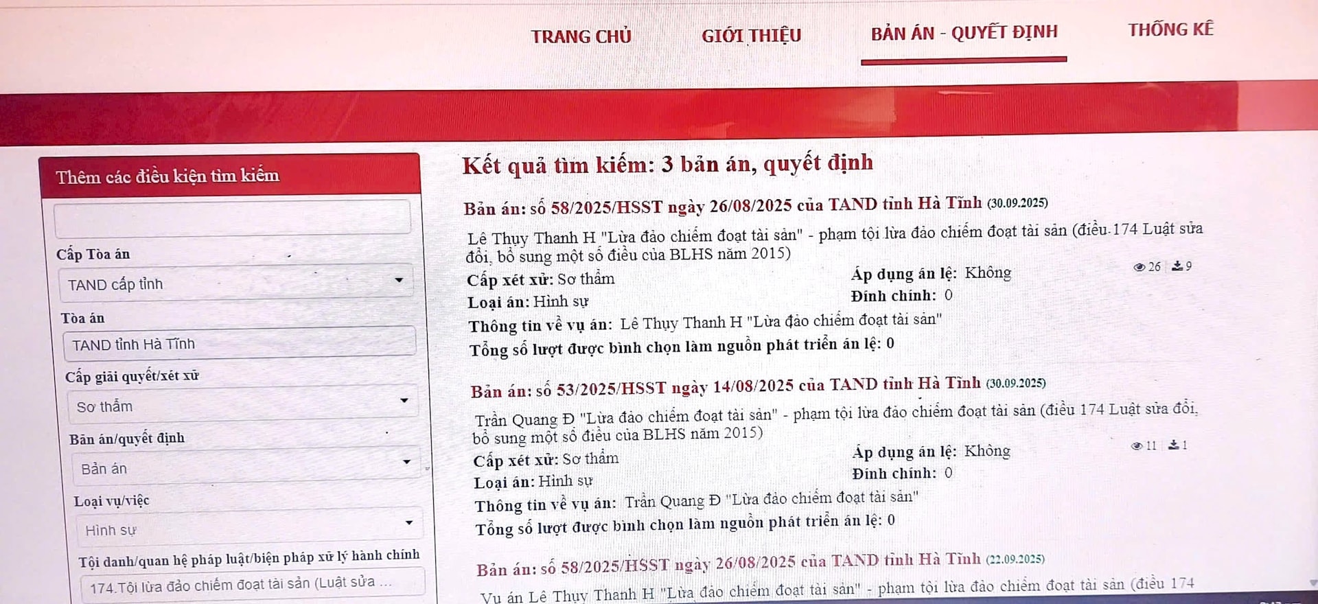 Sau khi nhập các thông tin cần thiết về cấp Tòa án, loại vụ việc, không mất nhiều thời gian, anh H. đã tìm thấy bản án số: 53/2025/HSST ngày 14/8/2025 do TAND tỉnh Hà Tĩnh xét xử.