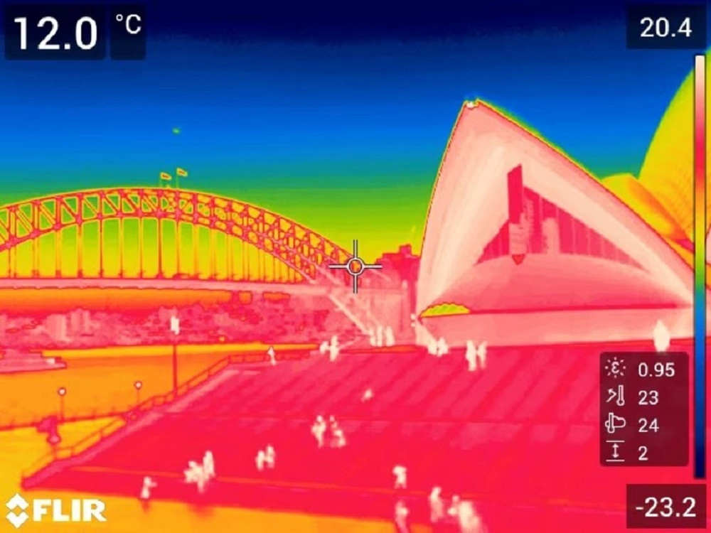 Bức ảnh được chụp bằng máy ảnh hồng ngoại cho thấy Nhà hát Opera Sydney và Cầu Cảng Sydney phát ra nhiệt vào ban đêm. (Ảnh: CNN)
