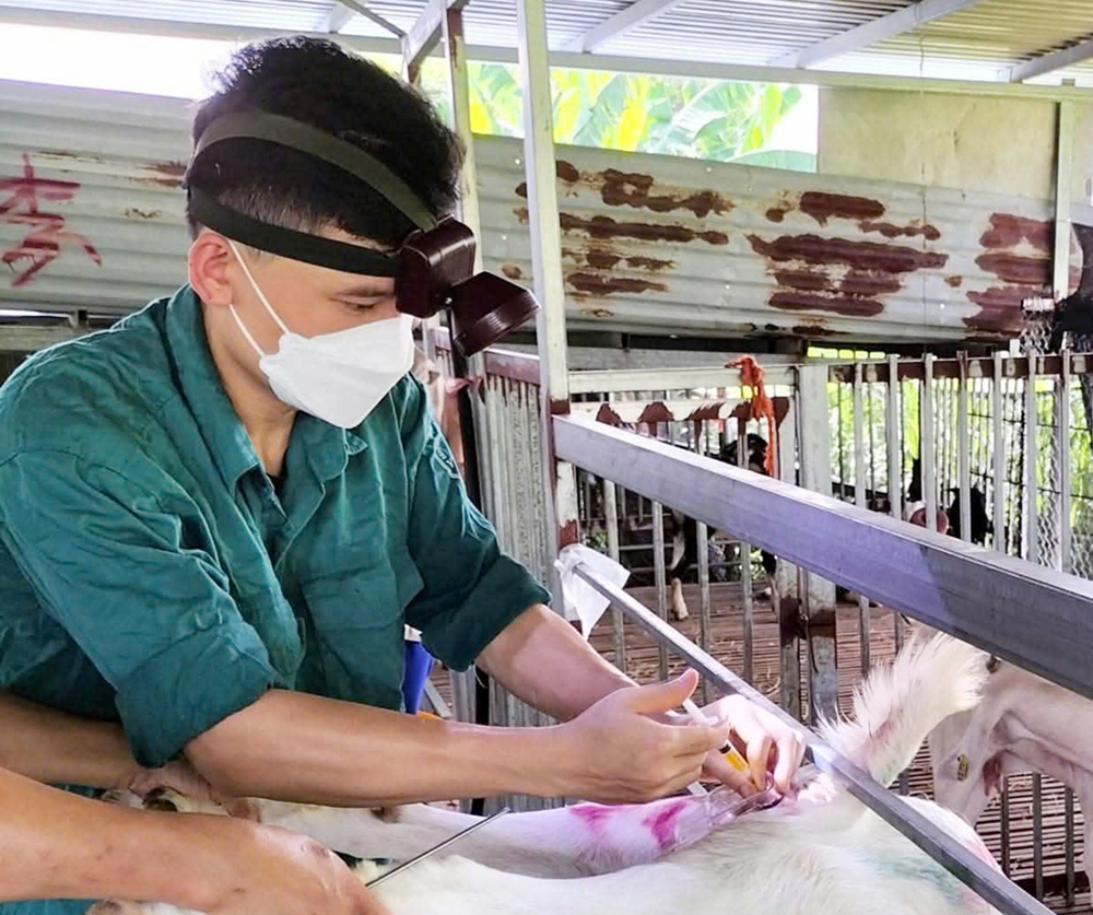 Thực hiện kỹ thuật thụ tinh nhân tạo cho vật nuôi tại Hợp tác xã Sản xuất, tiêu thụ dê và mật ong Hồng Kỳ, xã Đồng Kỳ.