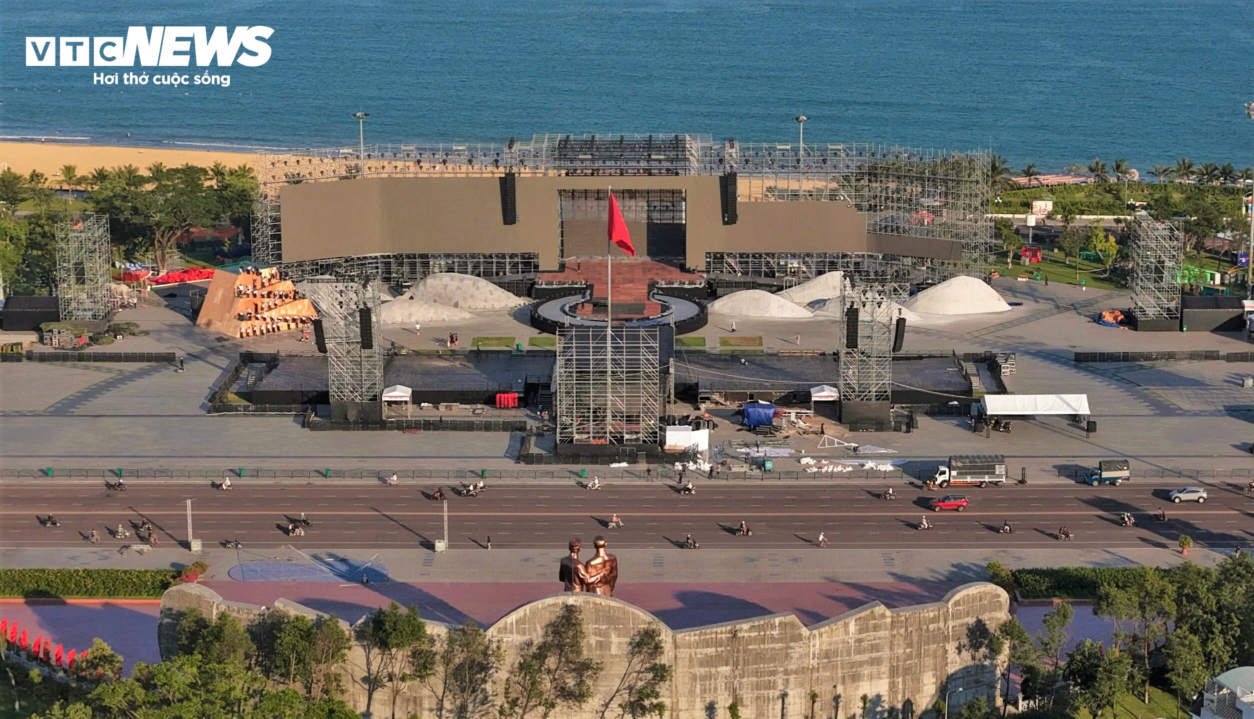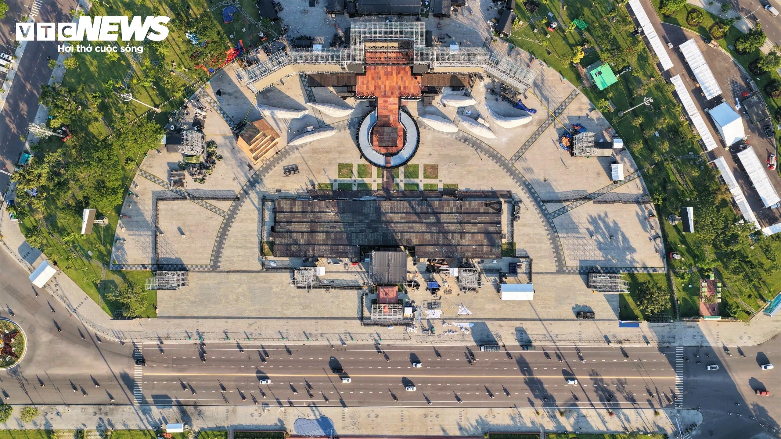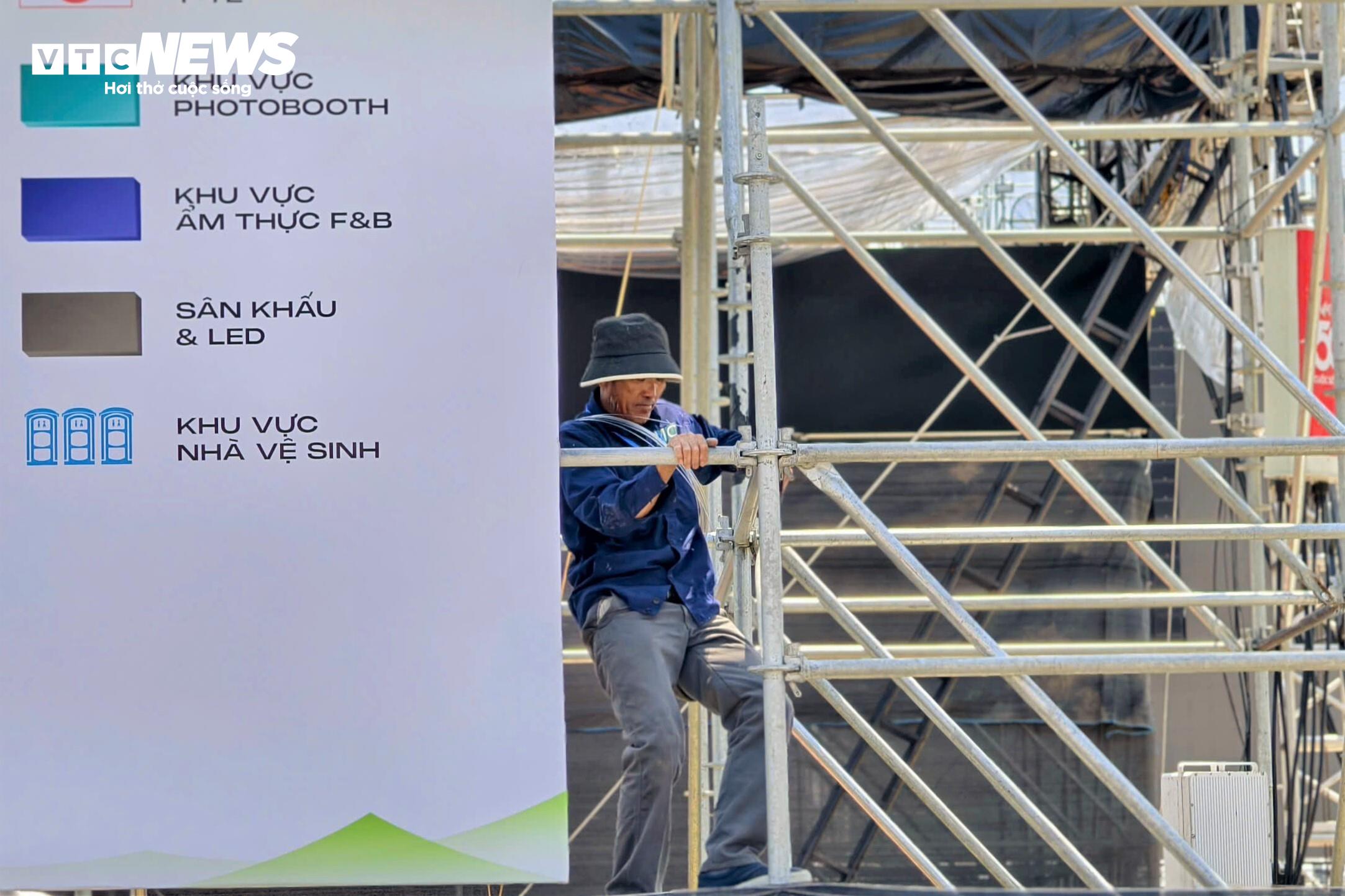 Trên giàn khung thép khổng lồ giữa lòng quảng trường là những bóng áo bảo hộ xanh, cam từ đội ngũ kỹ thuật lắp đặt hệ thống âm thanh và ánh sáng đang di chuyển giữa trưa đứng bóng.