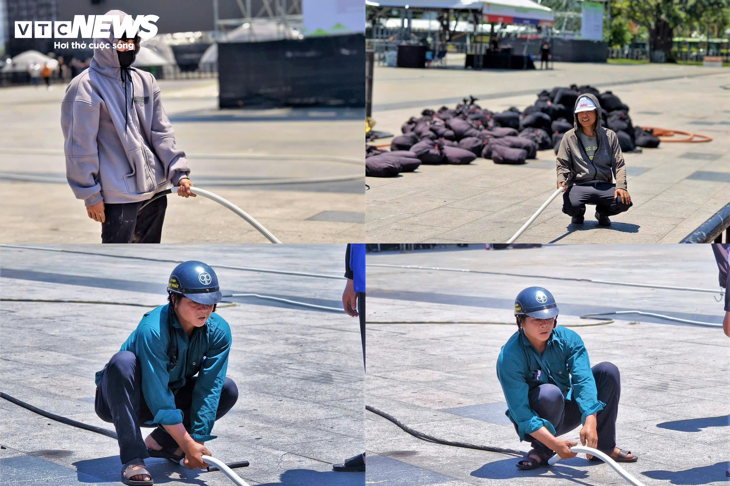 Nhiệt độ ngoài trời giữa trưa chạm ngưỡng 35°C, khu vực quảng trường ngổn ngang sắt thép, trang thiết bị và vang vọng tiếng máy hàn xì, tiếng búa gõ của hàng trăm bóng dáng công nhân điện, nước, môi trường, nhà mạng...