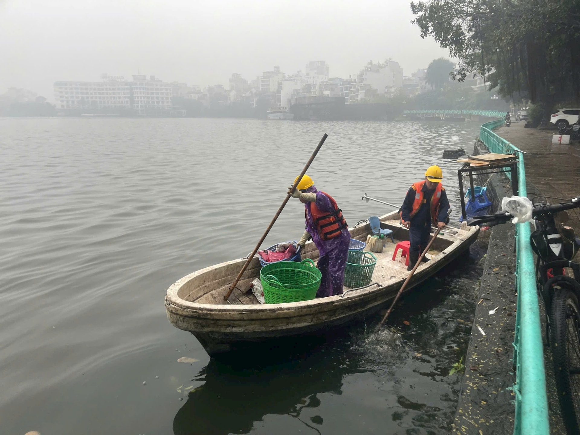Vớt rác, phế thải, vệ sinh ven hồ Tây. Ảnh: Uyên Hoàng