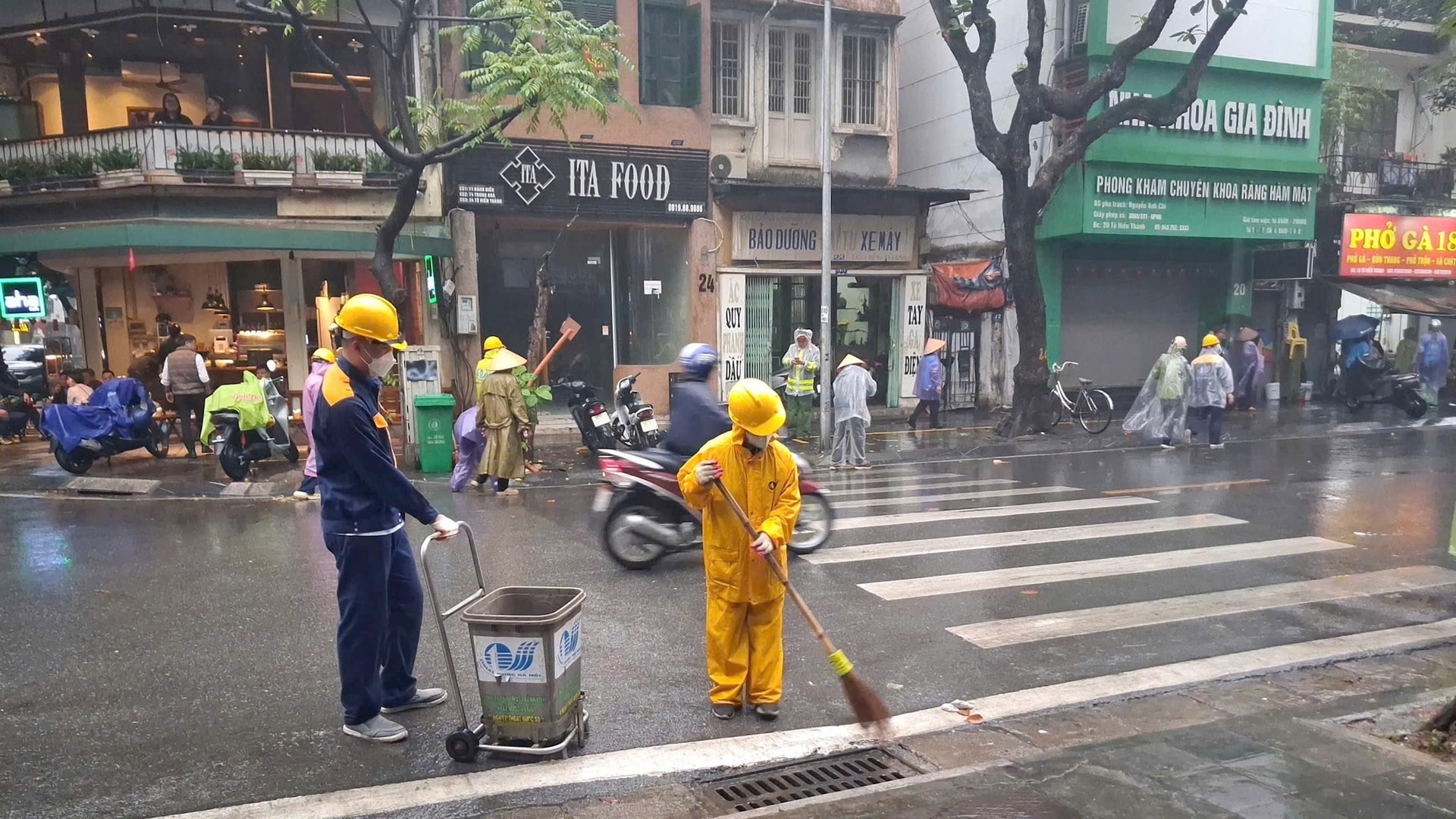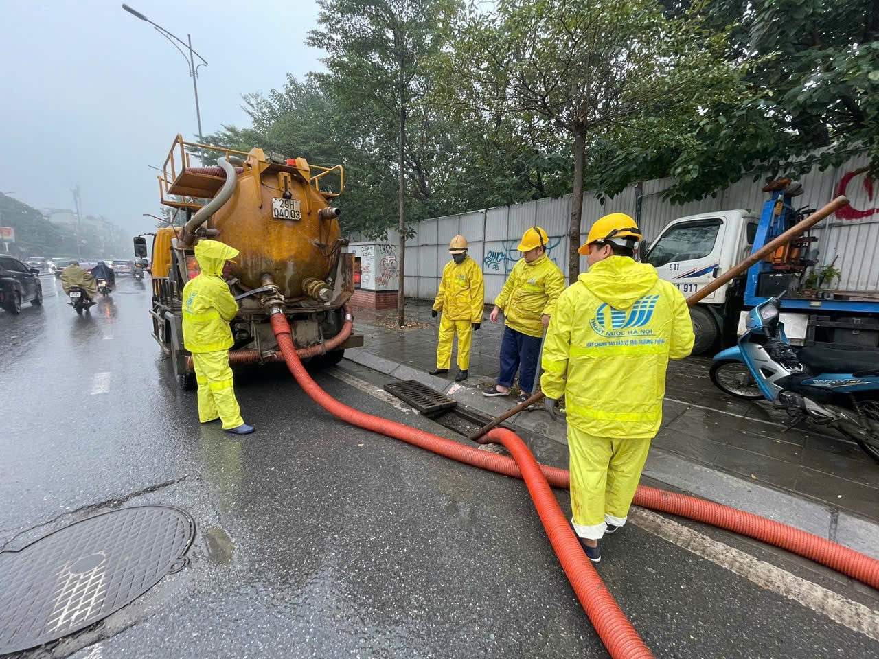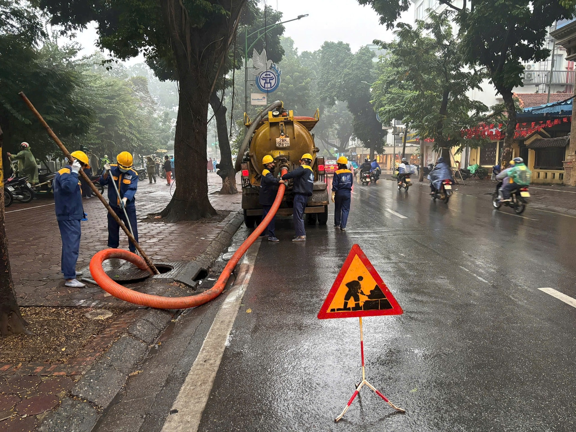 Công nhân Xí nghiệp Thoát nước số 1 làm nhiệm vụ trên địa bàn phường Ba Đình. Ảnh: Uyên Hoàng