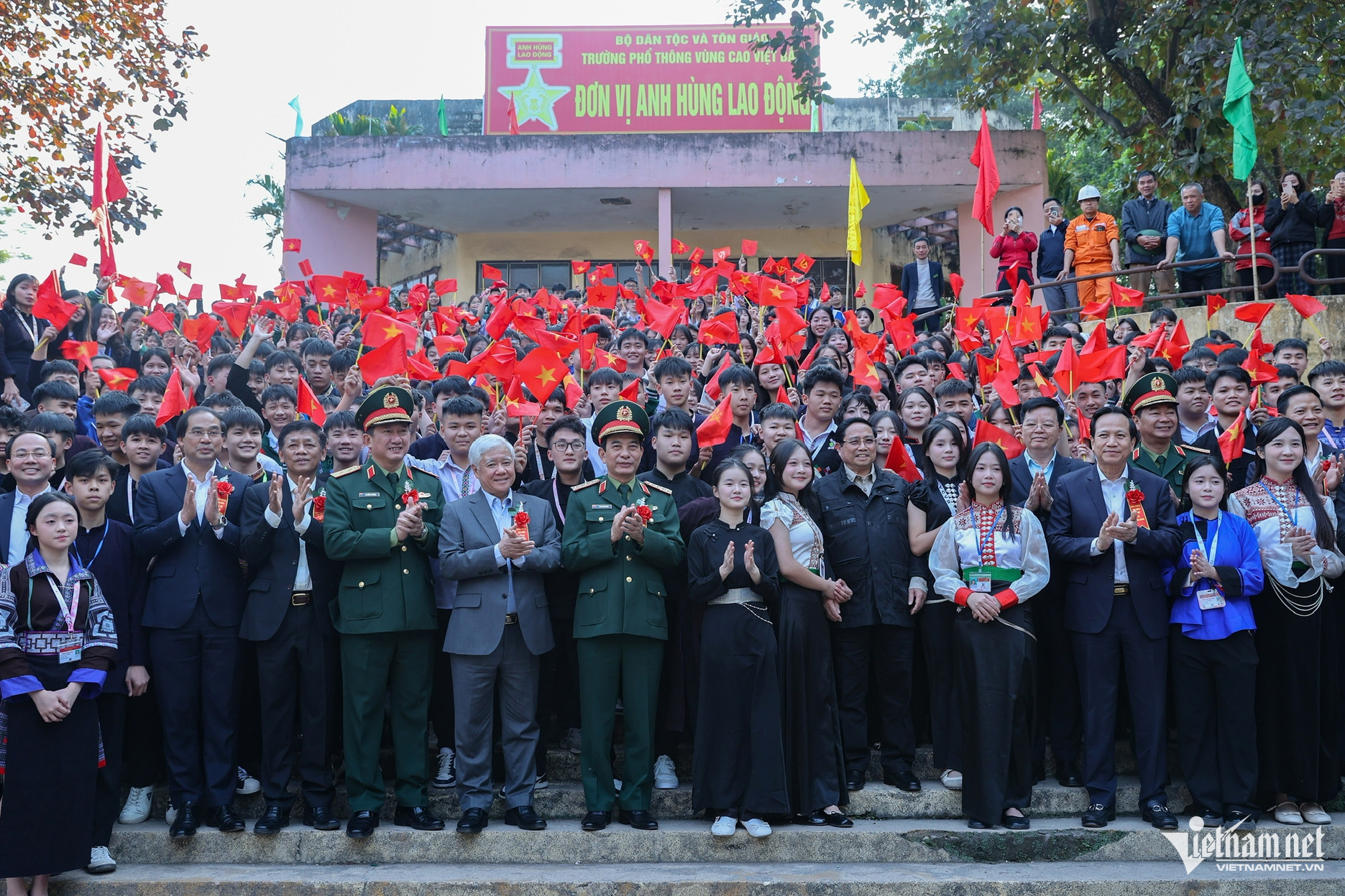 Thủ tướng Phạm Minh Chính và các đồng chí Lãnh đạo Đảng, Nhà nước, bộ, ngành, địa phương chụp ảnh lưu niệm cùng các em học sinh tại Lễ khởi công Dự án đầu tư cơ sở vật chất cho Trường Phổ thông Vùng cao Việt Bắc. (Ảnh: Lê Anh Dũng)