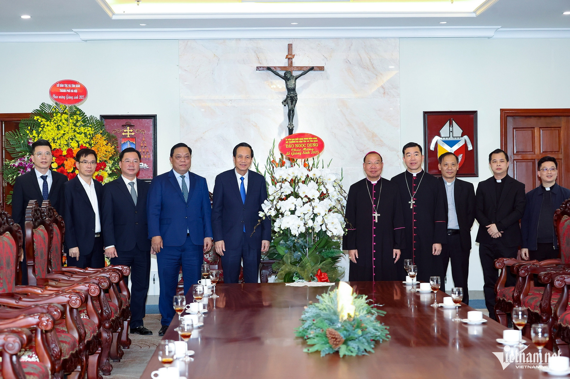 Bộ trưởng Đào Ngọc Dung, Thứ trưởng Nguyễn Hải Trung thăm, tặng quà Tòa Tổng Giám mục Tổng Giáo phận Hà Nội (tháng 12/2025). (Ảnh: Lê Anh Dũng)