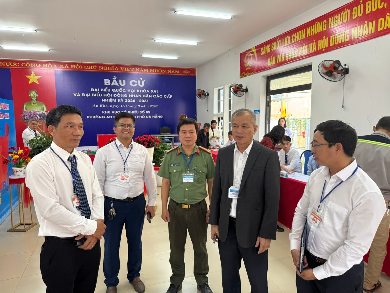 Phó Chủ nhiệm Ủy ban Kiểm tra Thành ủy Nguyễn Đức Tiến (thứ 2 từ phải qua) kiểm tra công tác bầu cử tại phường An Khê. Ảnh: V.N