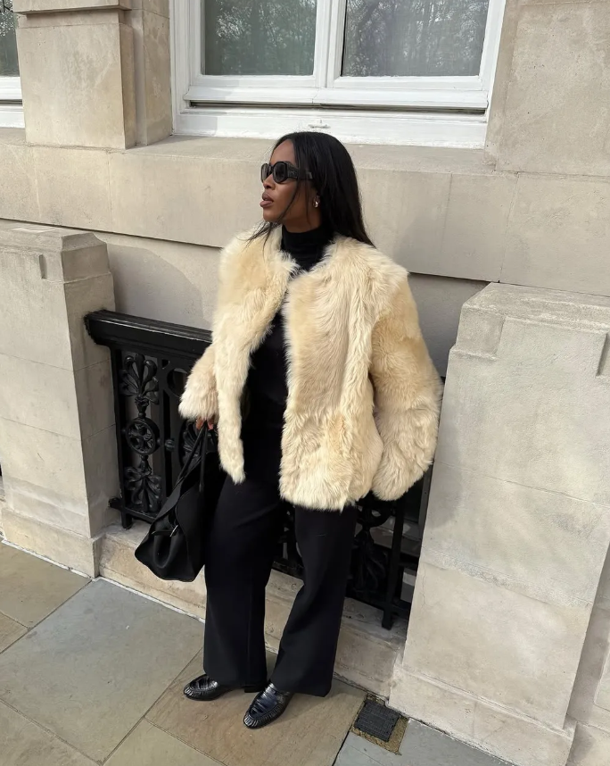 Áo khoác màu kem + Áo cổ lọ + Quần jeans + Giày bốt cổ thấp mũi nhọn. Ảnh: @nnennaechem