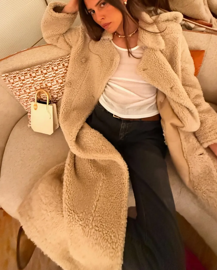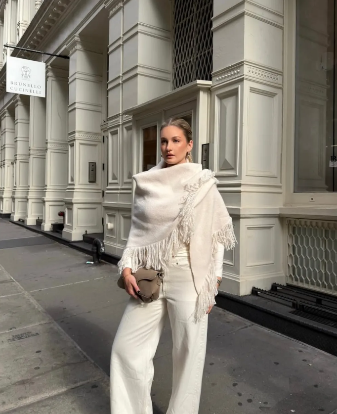 Áo khoác màu kem + Khăn choàng tua rua + Váy midi + Găng tay da + Giày bệt. Ảnh: @christietyler