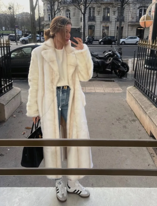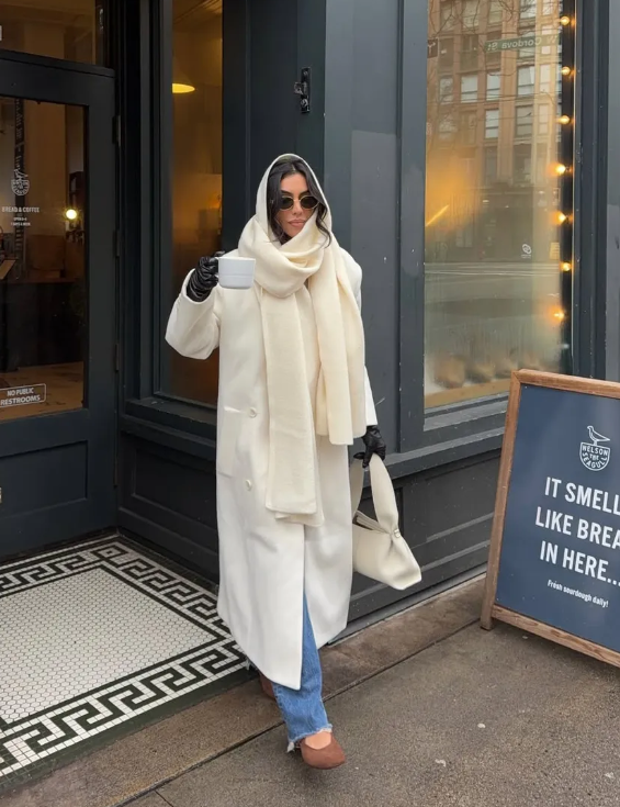 Áo khoác màu kem + Khăn choàng cổ có mũ màu kem + Quần jeans + Giày búp bê. Ảnh: @mobinapeiman