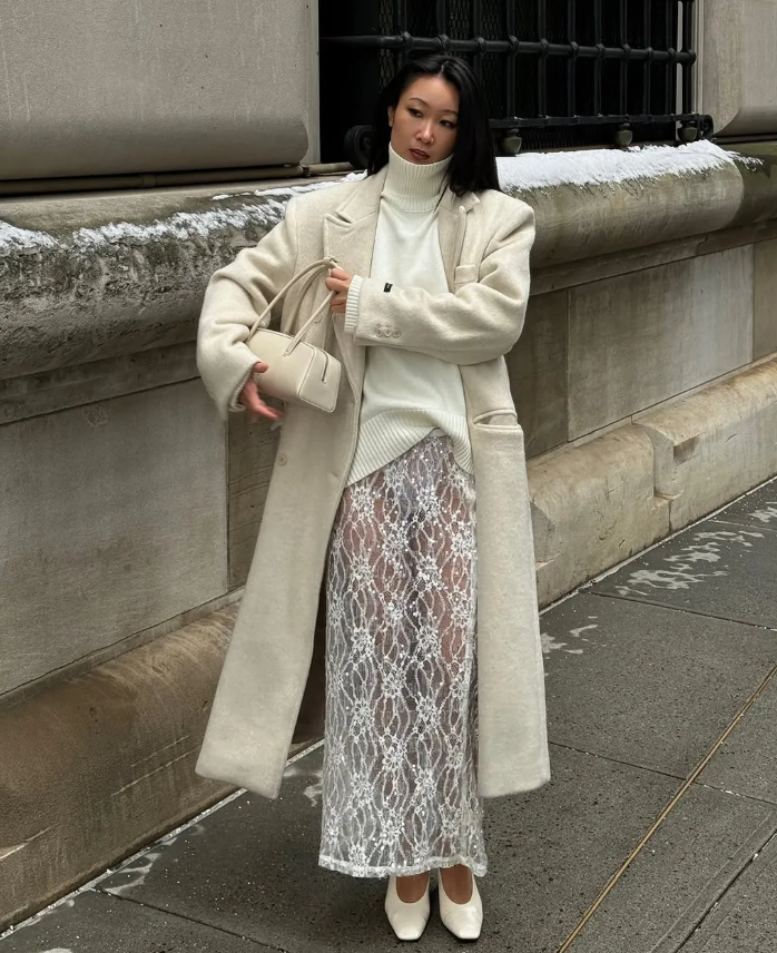 Áo khoác màu kem + Áo cổ lọ dày dặn màu kem + Chân váy ren + Giày cao gót. Ảnh: @thecarolinelin