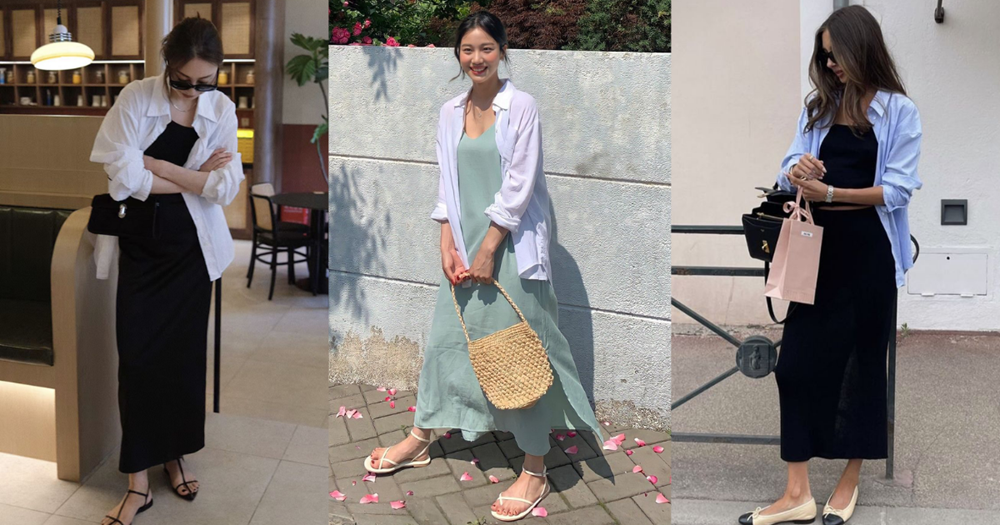 Sự kết hợp giữa áo sơ mi và váy hai dây mang đến tổng thể vừa nữ tính vừa hiện đại, đặc biệt phù hợp trong mùa hè.