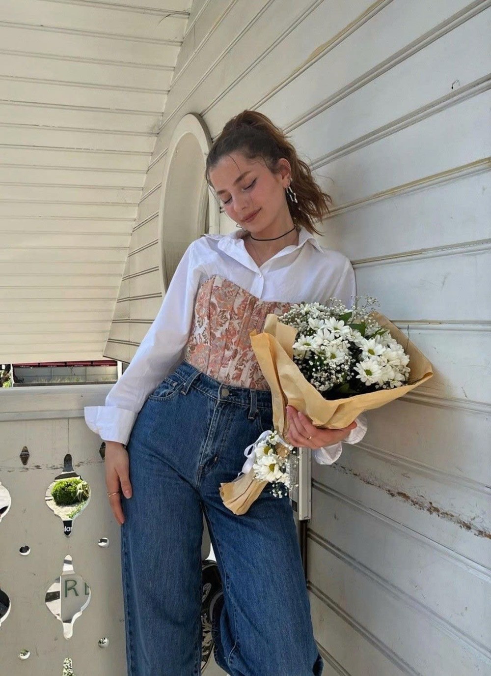 Bạn có thể mặc sơ mi trắng basic bên trong, layer corset bên ngoài với các màu như đen, nâu, hoặc denim.