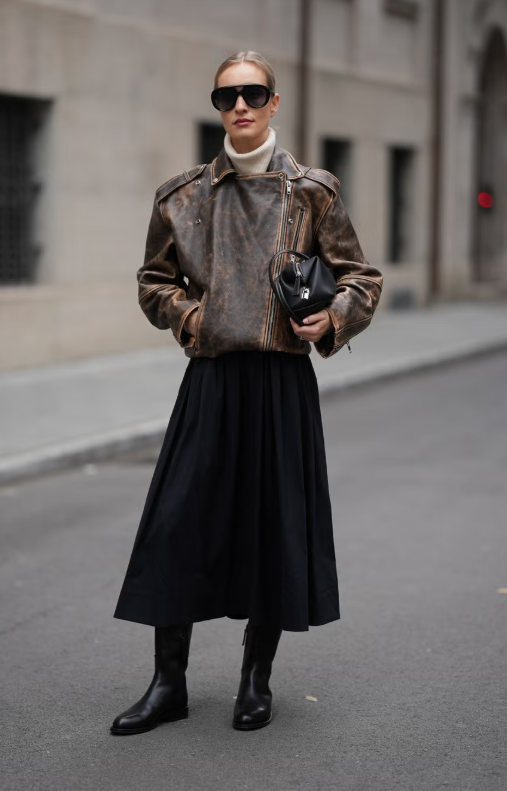 Trang phục thời tiết lạnh chủ yếu dựa vào chất liệu da. Hãy kết hợp áo khoác moto màu nâu với chân váy midi chữ A, sau đó kết hợp với áo len cổ lọ màu kem và bốt cao đến đầu gối làm phụ kiện chủ đạo. Đây là một bộ trang phục bạn có thể mặc đến công sở, nhưng vẫn toát lên vẻ sang trọng hơn hẳn so với trang phục công sở thông thường. Ảnh: harpersbazaar
