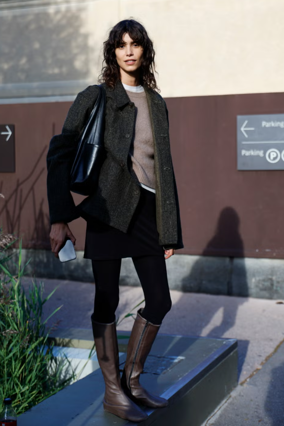 Nâu tiếp tục thống trị các xu hướng màu sắc hàng đầu của mùa này, xuất hiện trên mọi thứ, từ áo khoác đến túi xách. Bí quyết để phối hợp các tông màu khác nhau là sử dụng họa tiết, chẳng hạn như áo khoác da sờn kết hợp với áo len dệt kim đơn giản. Hãy kết hợp quần vải tweed màu xám để tạo điểm nhấn tương phản ở phần dưới và tránh cảm giác đơn điệu. Ảnh: harpersbazaar