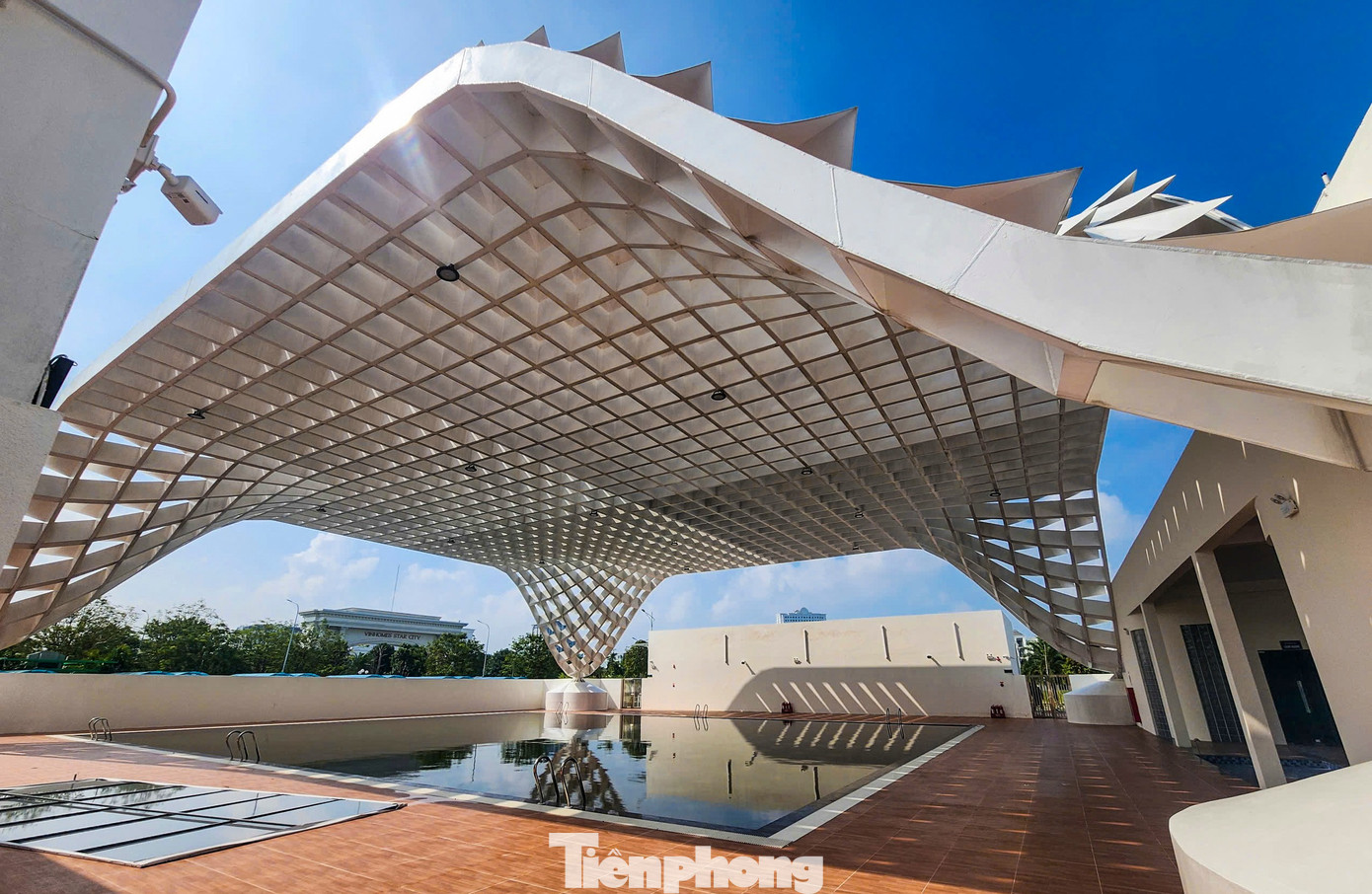 Bể bơi được thiết kế mái vòm khung thép độc đáo, diện tích mặt nước 500m2 với 8 làn bơi tiêu chuẩn, đủ điều kiện tổ chức các giải thiếu niên, nhi đồng.