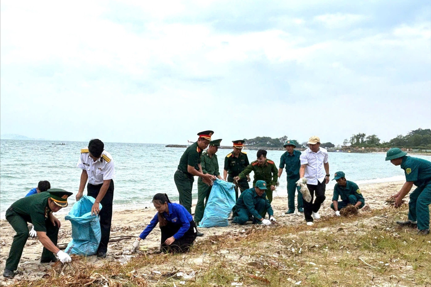 Cán bộ, chiến sĩ, đoàn viên, thanh niên, hội viên, học sinh trên xã đảo Tiên Hải tham gia thu gom rác thải, làm sạch bãi biển.