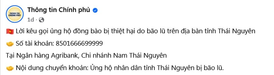 Dưới đây là thông tin để người dân có thể ủng hộ đồng bào ở Thái Nguyên bị thiệt hại do bão lũ, theo trang Thông tin Chính phủ: