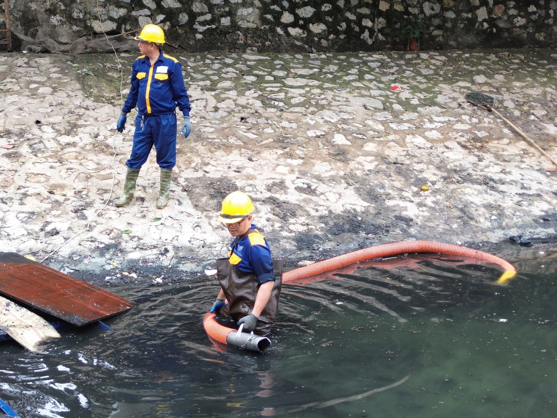 Thường xuyên đằm mình dưới làn nước ô nhiễm với những người công nhân thoát nước là công việc bình thường hằng ngày. Ảnh: Nguyễn Quý