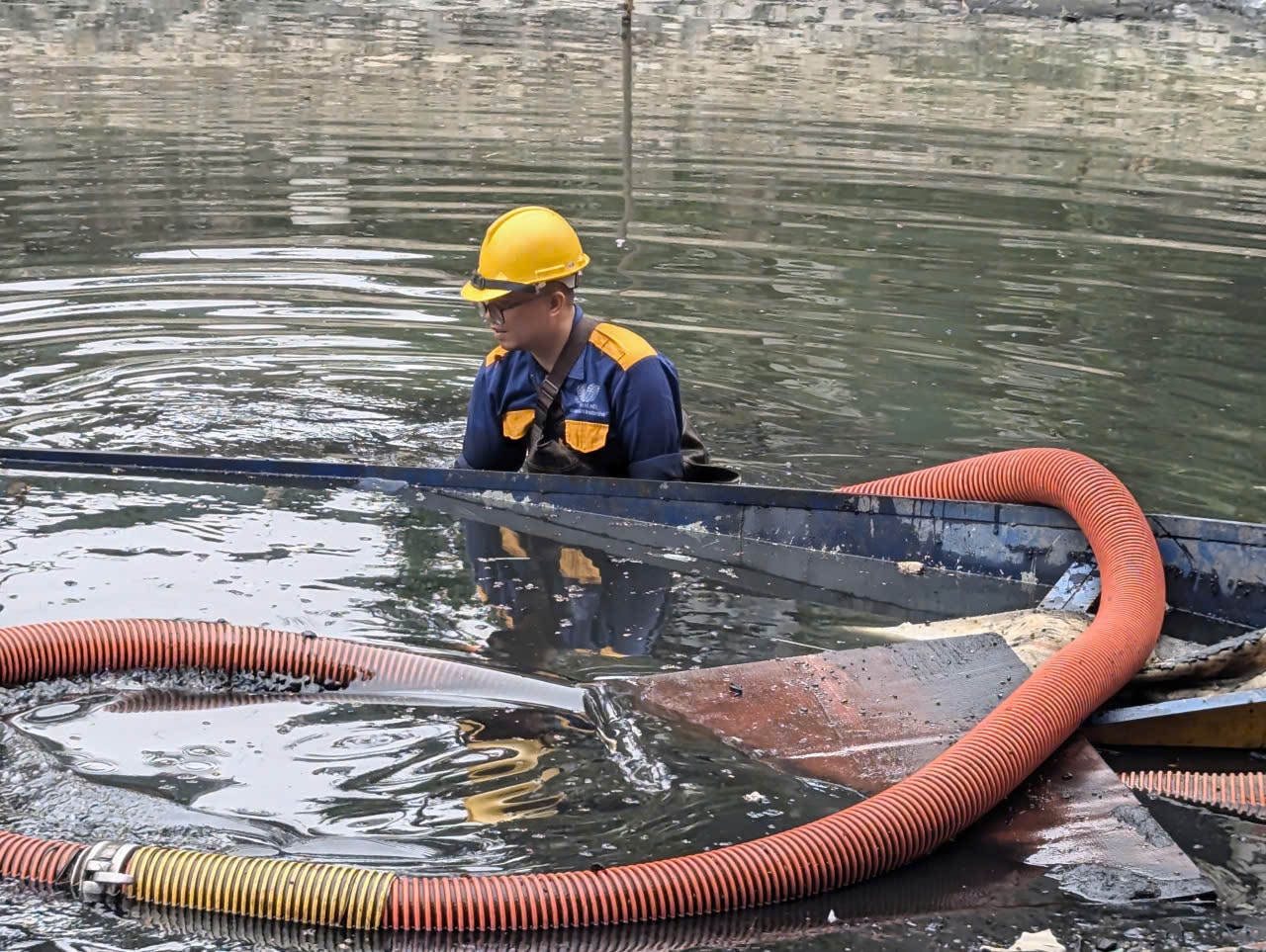 Công nhân Lê Bá Trường đằm mình dưới bùn và nước thải đen ngòm để thực hiện nhiệm vụ. Ảnh: Nguyễn Quý