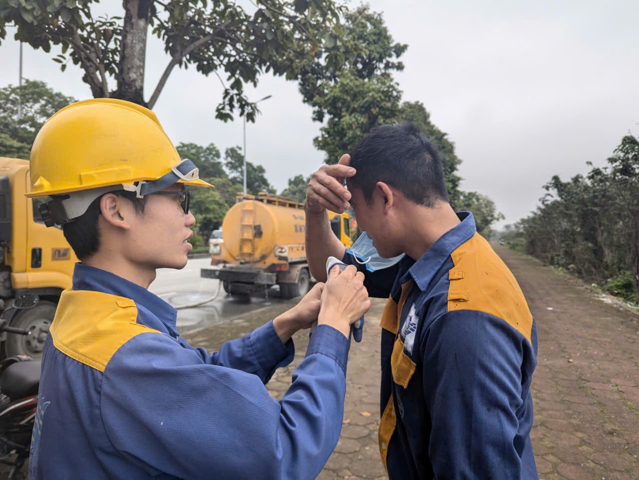 Đồng nghiệp hỗ trợ anh Trường lau chùi vết bùn bám trên mặt và đầu. Ảnh: Nguyễn Quý