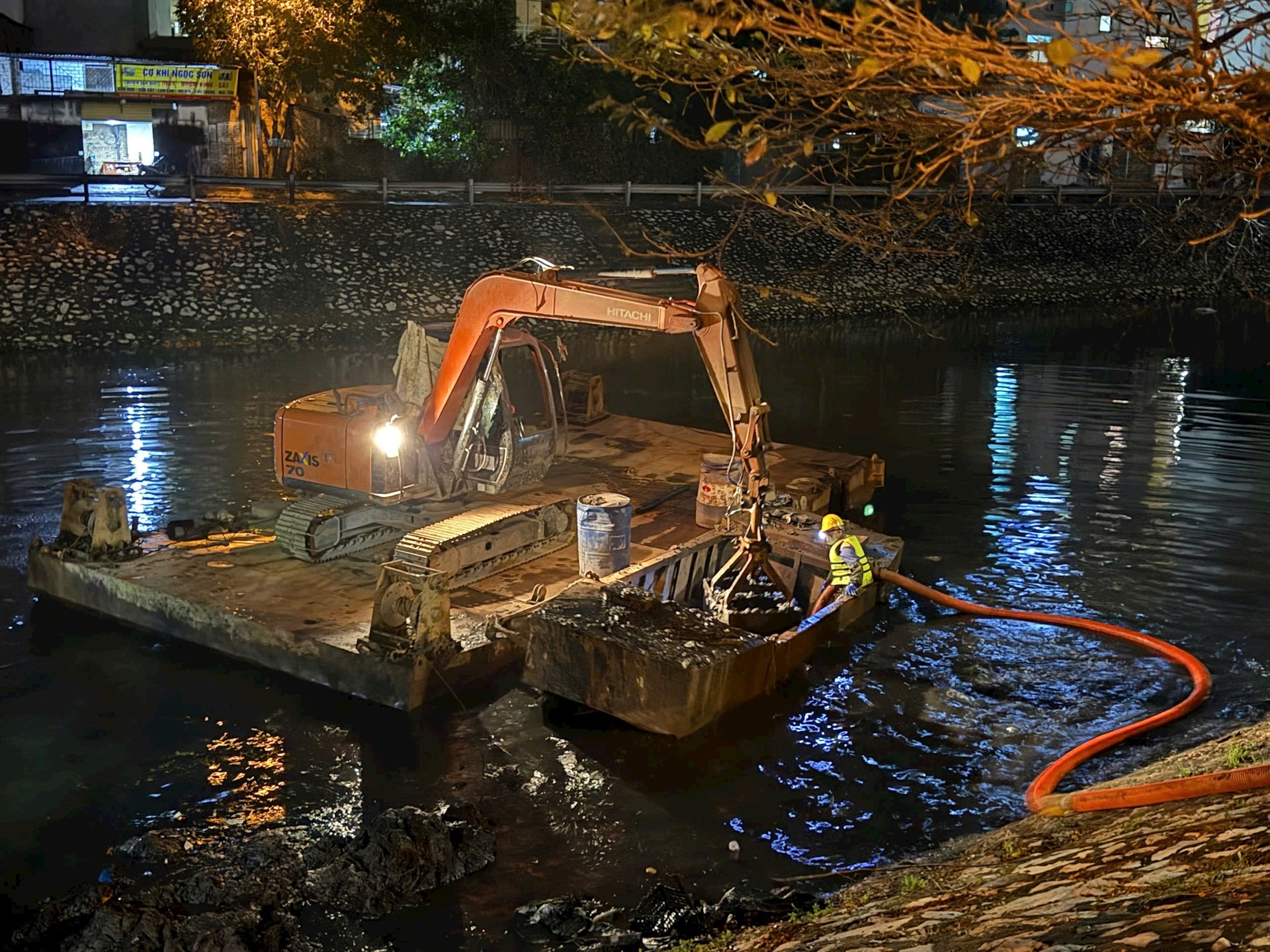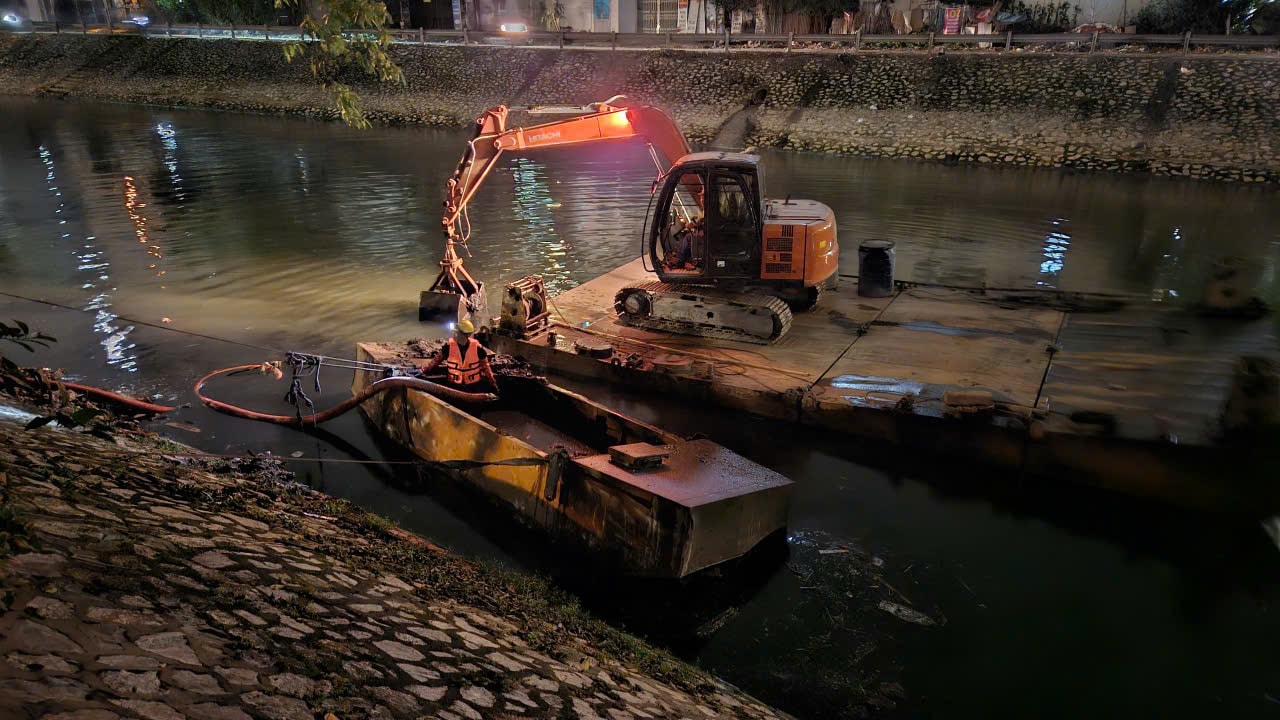 Công trường nạo vét sông Kim Ngưu hoạt động vào ban đêm. Ảnh: Nguyễn Quý