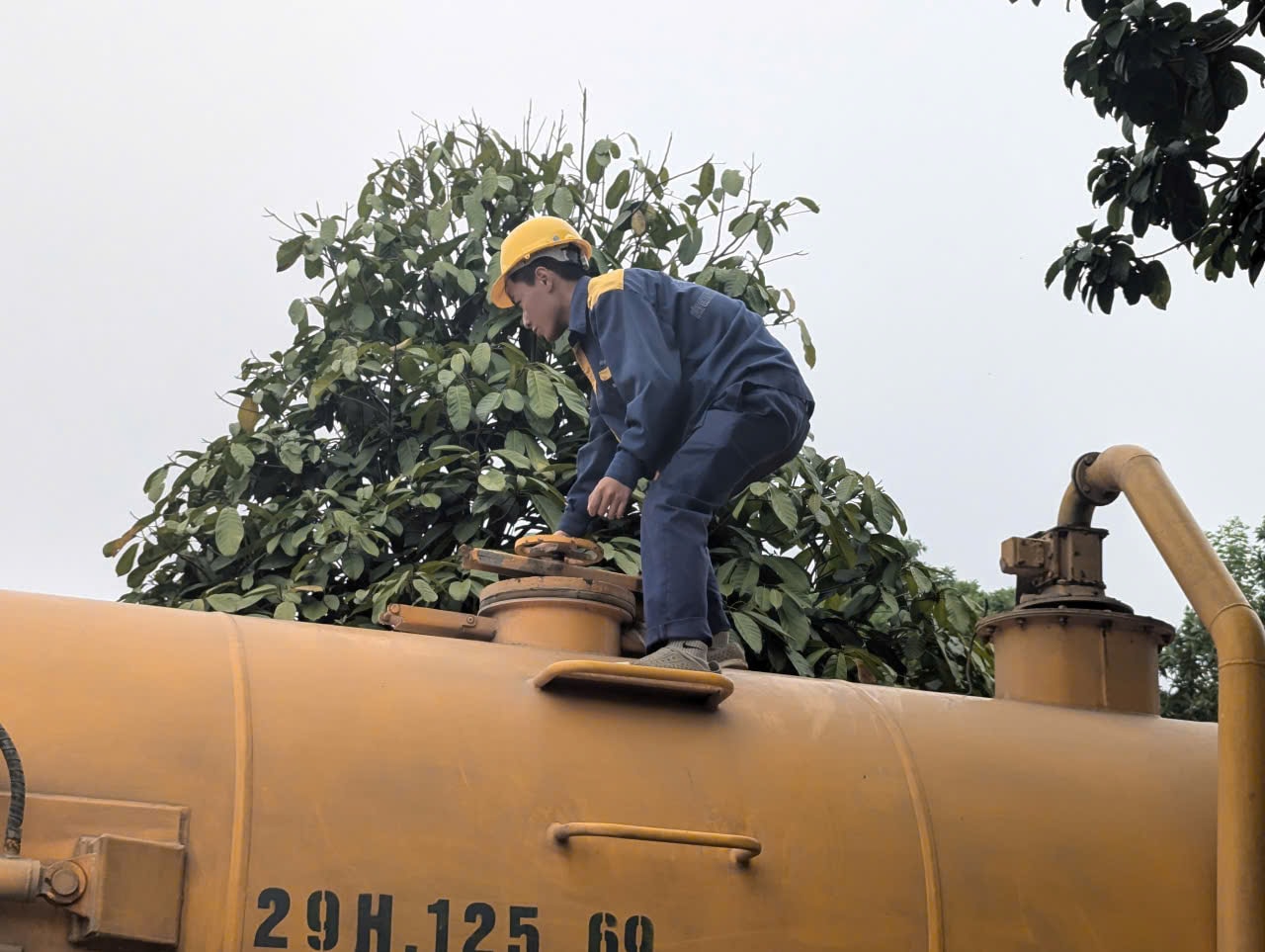 Trên bờ, chiếc xe bồn chở bùn thải luôn trong trạng thái sẵn sàng. Ảnh: Nguyễn Quý