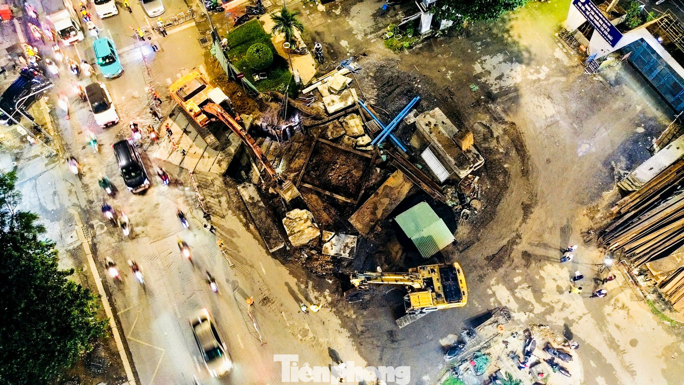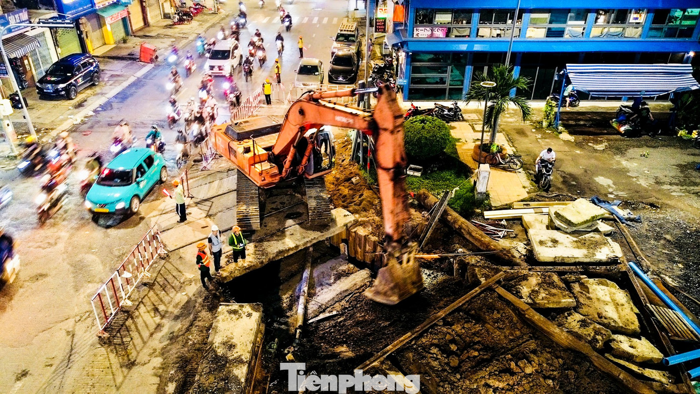 Công nhân thi công xuyên đêm tại ga S7 (Bảy Hiền) để xử lý hạ tầng kỹ thuật phục vụ tuyến metro số 2. Đây là một công đoạn phức tạp trong dự án Metro số 2 (Bến Thành - Tham Lương).