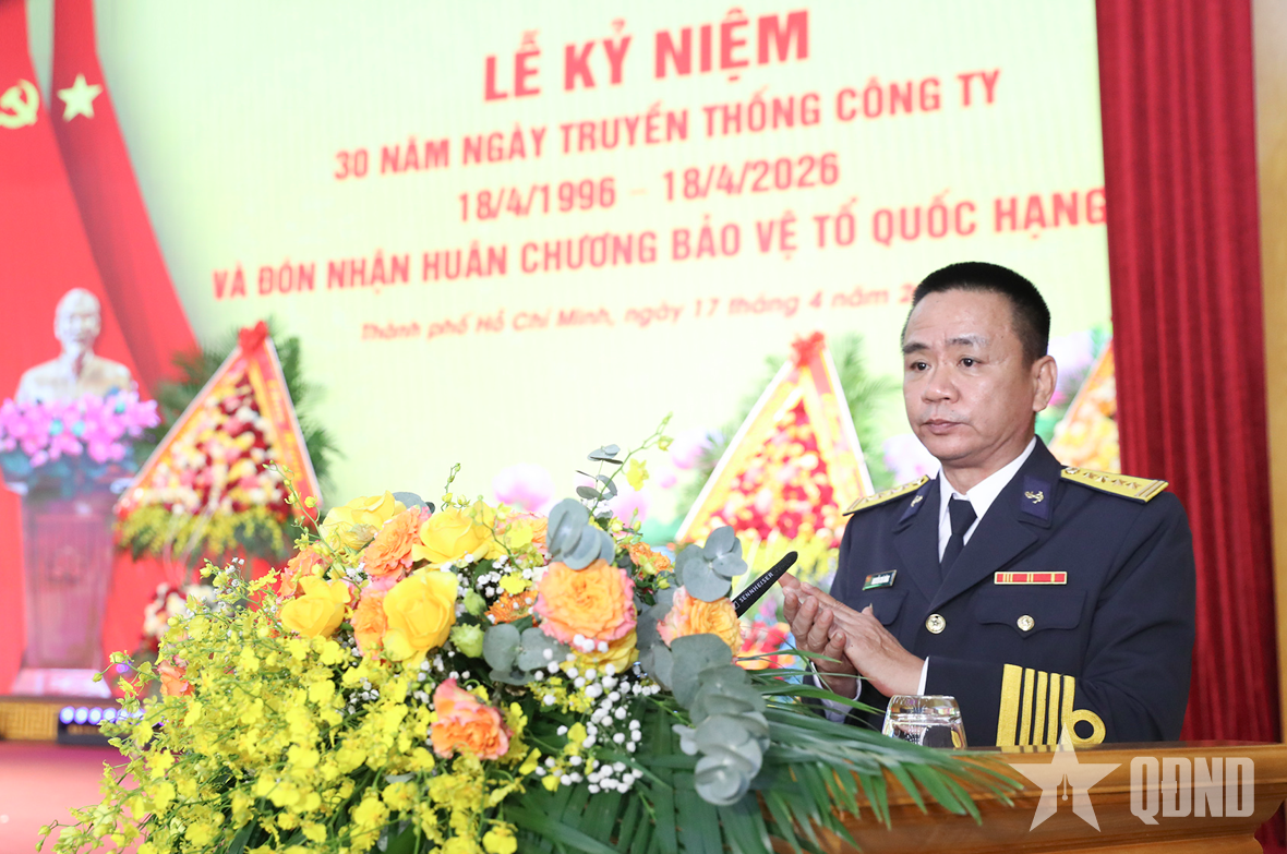 Đại tá Nguyễn Chí Dũng, Giám đốc Công ty cổ phần Xây dựng công trình Tân Cảng trình bày diễn văn.