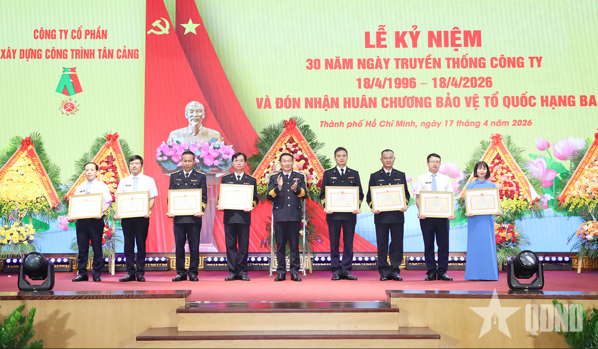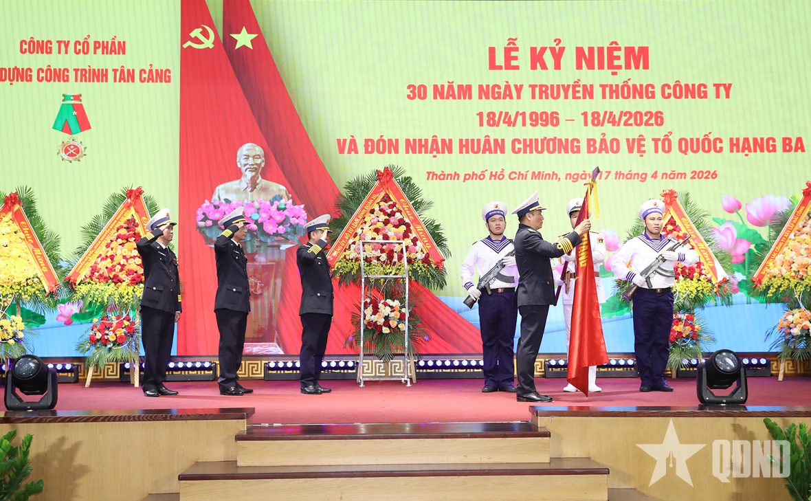 Đại tá Bùi Văn Quỳ trao Huân chương Bảo vệ Tổ quốc hạng Ba tặng Công ty cổ phần Xây dựng công trình Tân Cảng.