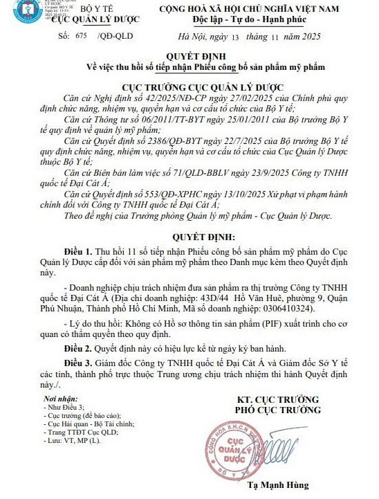 Cục Quản lý Dược (Bộ Y tế) vừa ban hành Quyết định số 675/QĐ-QLD, chính thức thu hồi giấy phép công bố lưu hành đối với 11 sản phẩm mỹ phẩm do Công ty TNHH Quốc tế Đại Cát Á, địa chỉ doanh nghiệp: 43D/44 Hồ Văn Huê, phường 9, quận Phú Nhuận (cũ), TP Hồ Chí Minh chịu trách nhiệm đưa ra thị trường.