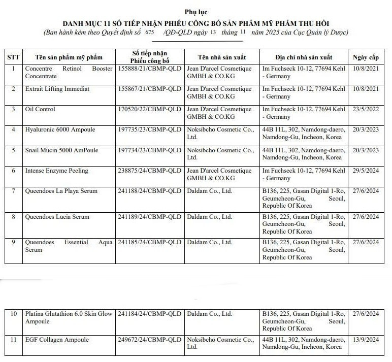 Danh mục 11 sản phẩm bị thu hồi rất đa dạng, bao gồm các loại serum, kem dưỡng và ampoule từ các thương hiệu nổi tiếng của Đức và Hàn Quốc. Bao gồm: