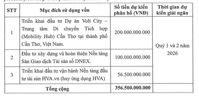 Cụ thể, HVA sẽ phân bổ 200 tỷ đồng để triển khai đầu tư Dự án Volt City - Trung tâm Di chuyển tích hợp tại Cần Thơ, 100 tỷ đồng đầu tư xây dựng và hoàn thiện nền tảng sàn giao dịch tài sản số DNEX. Khoản tiền 56,5 tỷ đồng sẽ được dùng để phục vụ đầu tư và vận hành nền tảng đầu tư tài sản HVA.vn, hay ứng dụng HVA. Thời gian giải ngân các hạng mục trên dự kiến trong quý I và II/2026.
