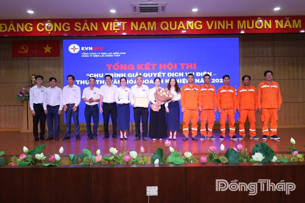Phó Giám đốc công ty Nguyễn Chí Thanh (thứ 5 từ trái qua) trao giải Nhất tập thể cho Điện lực Sa Đéc tại hội thi.