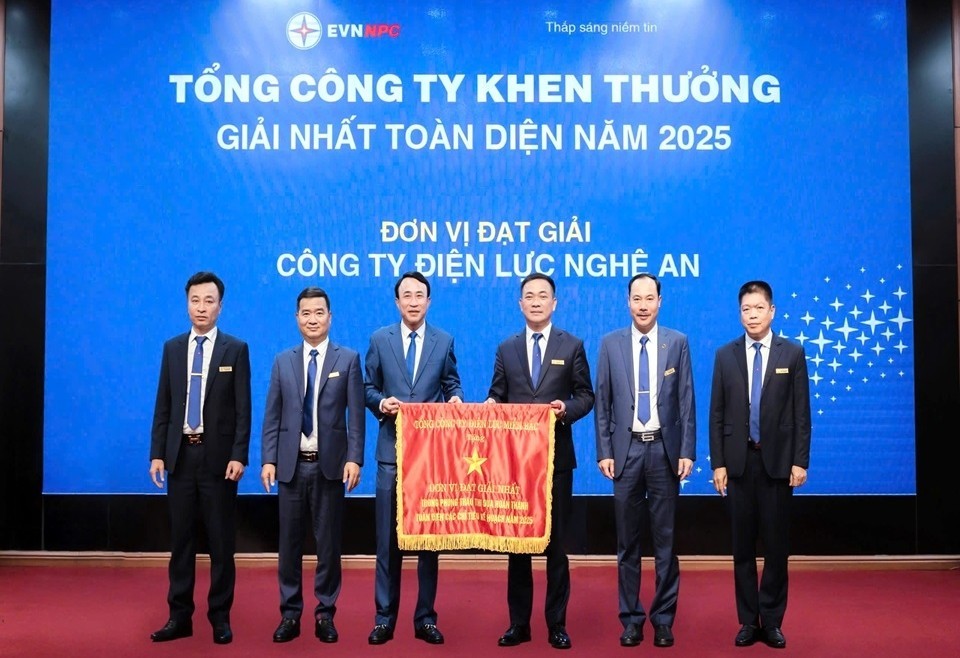 Công ty Điện lực Nghệ An nhận cờ thi đua của Tổng Công ty Điện lực miền Bắc vì có thành tích xuất sắc hoàn thành toàn diện các nhiệm vụ năm 2025. Ảnh: Điện lực Nghệ An