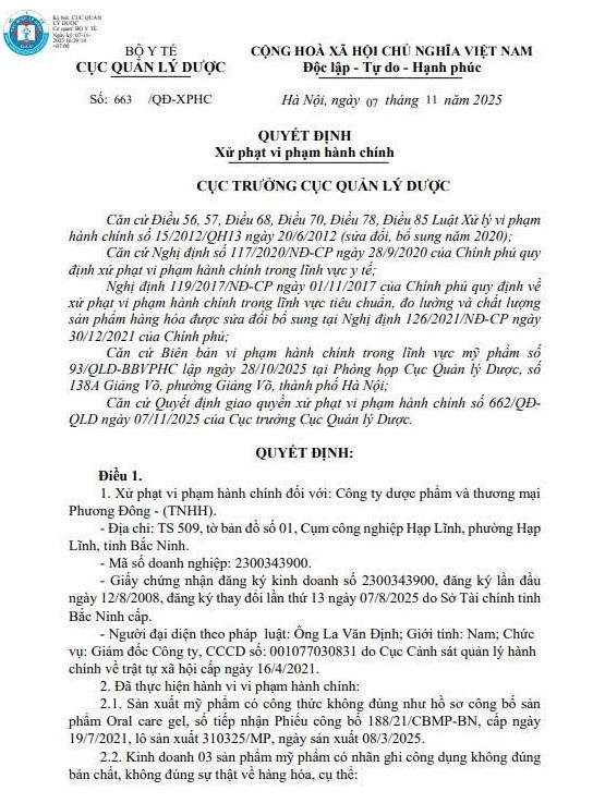Cục Quản lý Dược vừa ban hành Quyết định số 663/QĐ-XPHC ngày 07/11/2025 về việc xử phạt vi phạm hành chính đối với Công ty Dược phẩm và Thương mại Phương Đông - (TNHH), địa chỉ: TS 509, tờ bản đồ số 01, Cụm công nghiệp Hạp Lĩnh, phường Hạp Lĩnh, tỉnh Bắc Ninh.