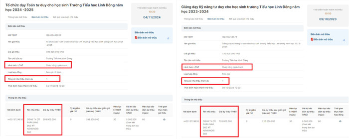 Theo tìm hiểu các gói thầu, Công ty Cổ phần Giáo dục Kỹ năng Ngôi Sao trúng các gói thầu trong 3 năm liên tiếp tại Trường Tiểu học Linh Đông (phường Hiệp Bình).