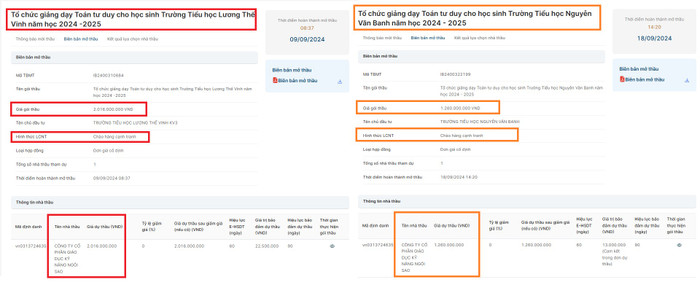 Tại Trường Tiểu học Nguyễn Văn Banh (phường Thủ Đức), Công ty Cổ phần Giáo dục Kỹ năng Ngôi Sao trúng gói thầu "Tổ chức giảng dạy Toán tư duy cho học sinh Trường Tiểu học Nguyễn Văn Banh năm học 2024 - 2025" trị giá 1.260.000.000 đồng. Hình thức lựa chọn nhà thầu là chào hàng cạnh tranh. Gói thầu thực hiện trong 9 tháng.
