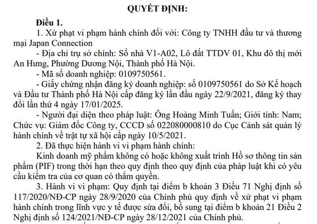 Theo Cục Quản lý Dược, Công ty Japan Connection đã kinh doanh mỹ phẩm không có hoặc không xuất trình Hồ sơ thông tin sản phẩm (PIF) theo quy định pháp luật khi được cơ quan có thẩm quyền kiểm tra, vi phạm điểm b khoản 3 Điều 71 Nghị định 117/2020/NĐ-CP ngày 28/9/2020 về xử phạt vi phạm hành chính trong lĩnh vực y tế, được sửa đổi, bổ sung tại điểm b khoản 21 Điều 2 Nghị định 124/2021/NĐ-CP.