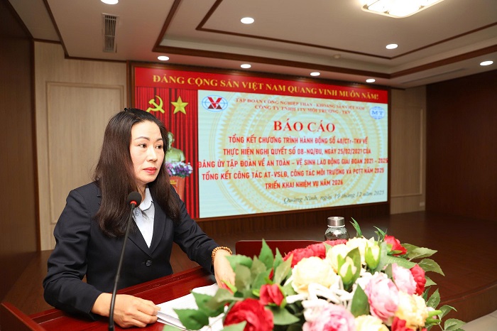 Tại Hội nghị, Phó Giám đốc Công ty - Triệu Thị Nhuận đã trình bày báo cáo tổng kết Chương trình hành động số 48/CTr-TKV và công tác ATVSLĐ, công tác môi trường, PCTT năm 2025. Báo cáo khẳng định, trong giai đoạn 2021-2025, bám sát Nghị quyết số 08-NQ/ĐU của Đảng ủy Tập đoàn, Đảng ủy và Ban lãnh đạo Công ty đã tập trung lãnh đạo, chỉ đạo triển khai đồng bộ các giải pháp nhằm nâng cao nhận thức, trách nhiệm của cán bộ, đảng viên, người lao động đối với công tác ATVSLĐ.