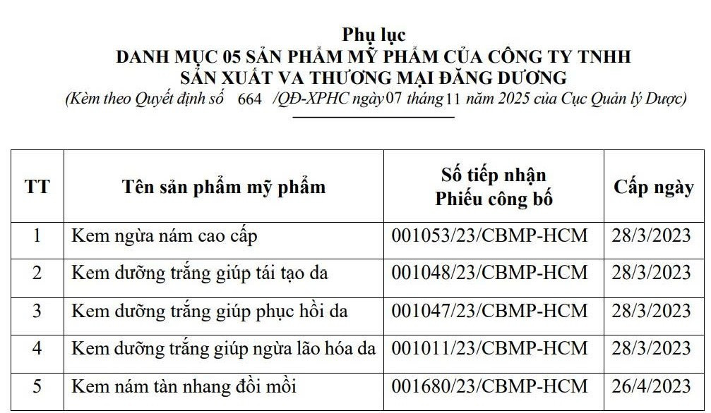 Cục Quản lý Dược vừa ban hành Quyết định số 664/QĐ-XPHC ngày 07/11/2025 về việc xử phạt vi phạm hành chính đối với Công ty TNHH Sản xuất và Thương mại mỹ phẩm Đăng Dương (địa chỉ trụ sở chính: 59 đường số 1B, khu phố 8, P. Bình Trị Đông B, quận Bình Tân (cũ), TP HCM).