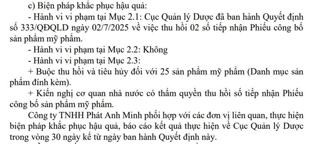 Ngoài ra, Công ty TNHH Phát Anh Minh bị buộc thu hồi và tiêu hủy 25 sản phẩm mỹ phẩm không đủ điều kiện pháp lý. Đồng thời, doanh nghiệp phải phối hợp với các đơn vị liên quan để thực hiện các biện pháp khắc phục hậu quả và kiến nghị cơ quan nhà nước có thẩm quyền thu hồi số tiếp nhận Phiếu công bố sản phẩm mỹ phẩm.