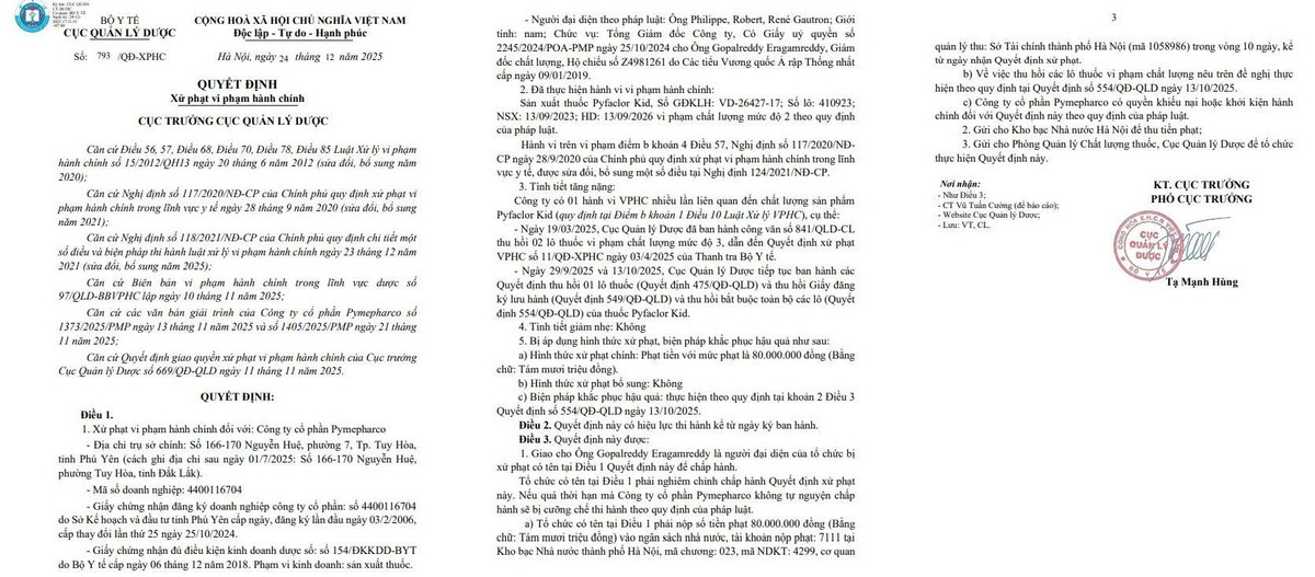 Ngày 24/12/2025, Cục Quản lý Dược (Bộ Y tế) đã ban hành Quyết định số 793/QĐ-XPHC về việc xử phạt vi phạm hành chính đối với Công ty Cổ phần Pymepharco.