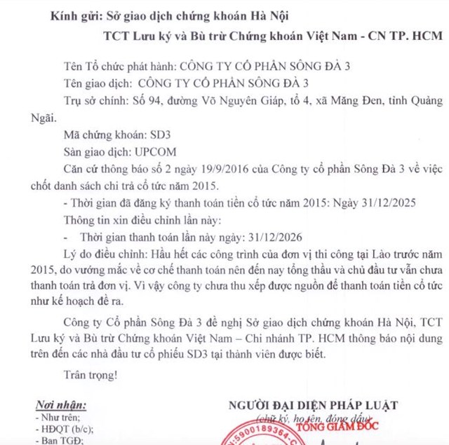 Công văn của SD3 nêu rõ, việc xin điều chỉnh thời gian đăng ký thanh toán tiền cổ tức năm 2015 từ ngày 31/12/2025 sang ngày 31/12/2026, tức nới thêm 1 năm.